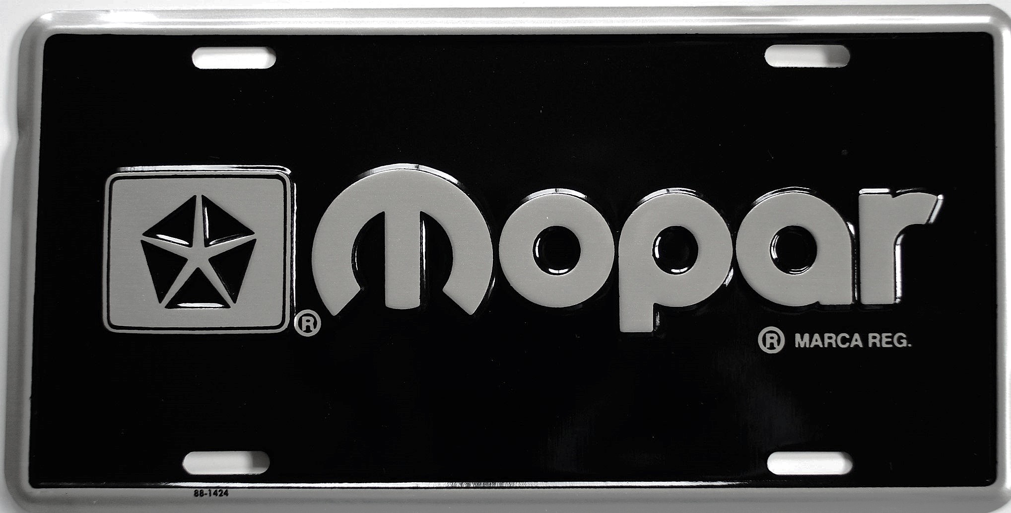 Mopar novelty plate, 12 x 6, black background, with brushed aluminum embossed graphics. Licensed Chrysler product. We do not have too many of these left. These are made of the slightly thinner aluminum, which gives it a little bit of a wiggle.