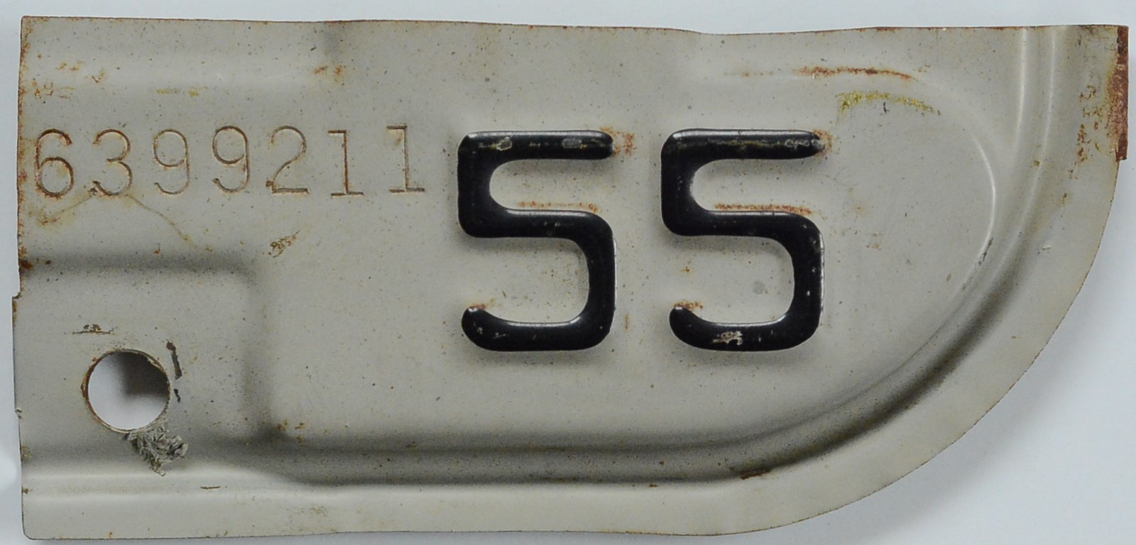 Vintage 1955 California license plate tab that attaches to your old 1951 California license plate. If you have a 1955 model year vehicle, this can be used on an approved 1951 base plate for the Year of Manufacture Program. There are a few scratches and spots of surface rust. The small wrap around tab is bent back behind the tab.