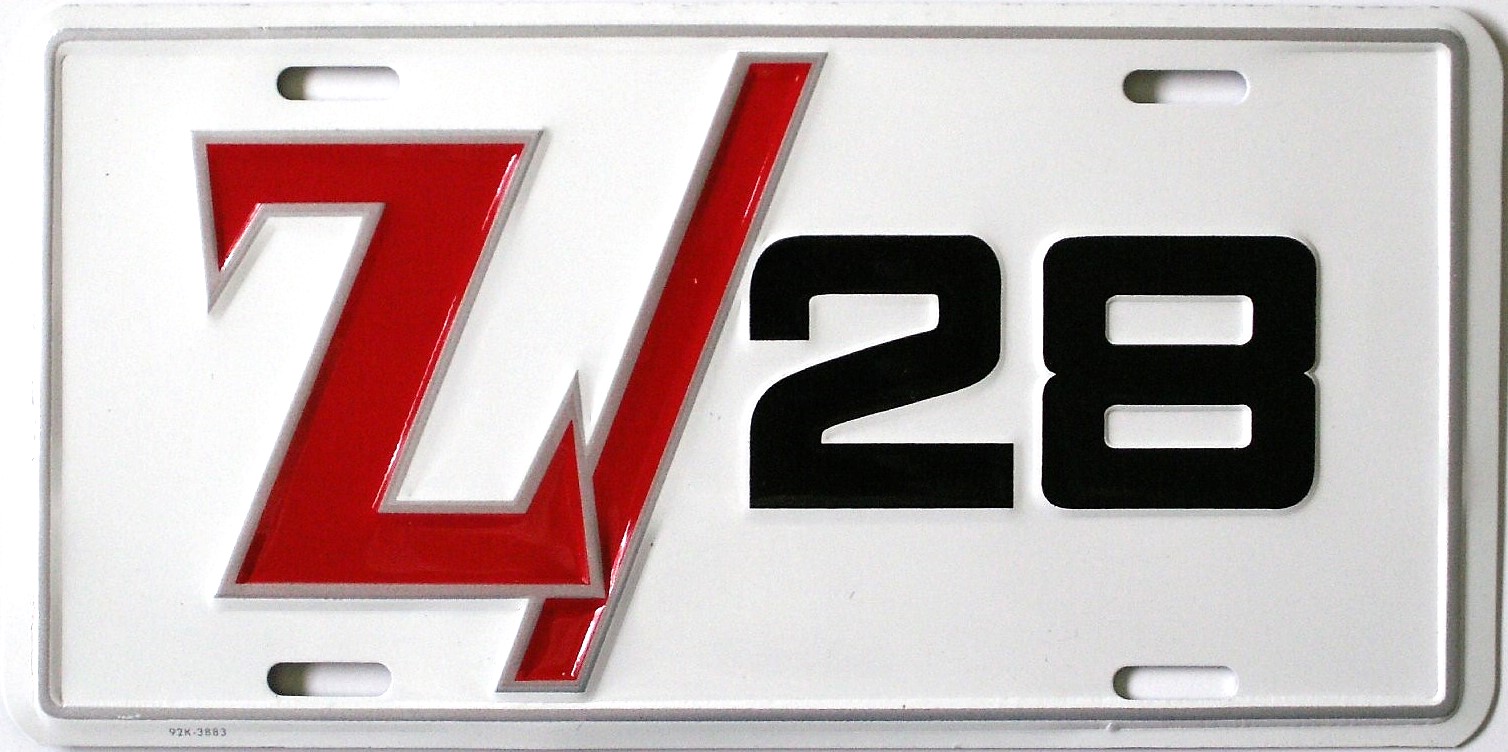 Vintage Chevrolet Camaro Z 28 license plate (hard to find these days). Back side is the older blue color. We purchased this many years ago, as we are not set up to make plates. This is an embossed aluminium plate, with red, silver and black graphics, on a white background, with a silver border.